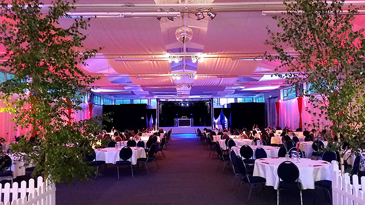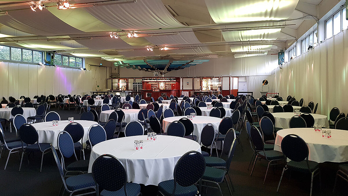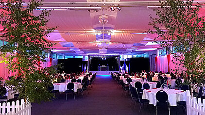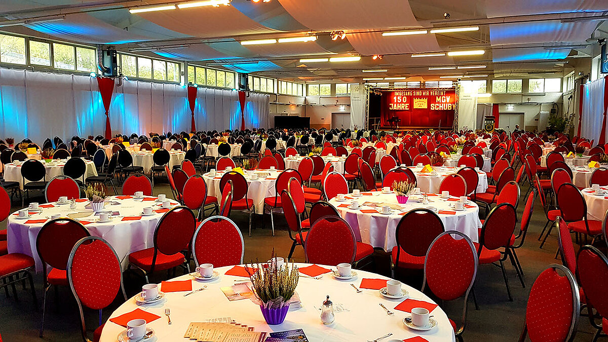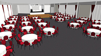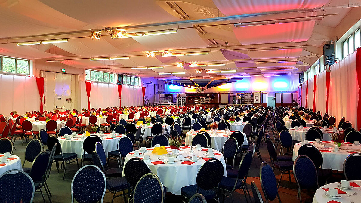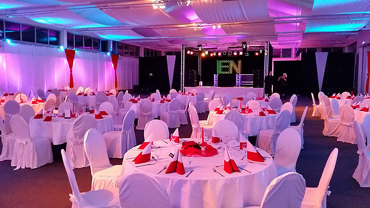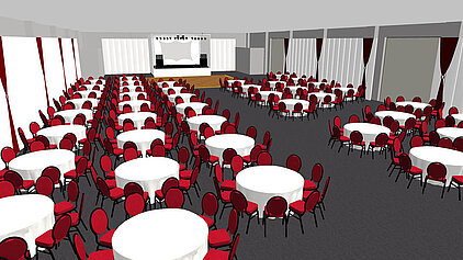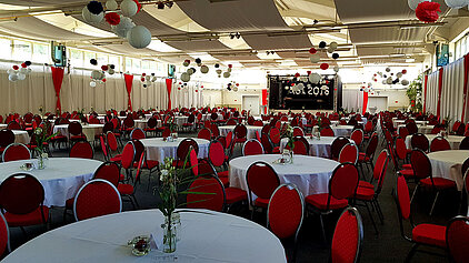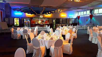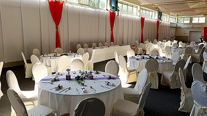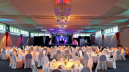Die Festhalle Silberstedt lässt sich mit runden Tischen zu einem besonderen Ballsaal verwandeln.