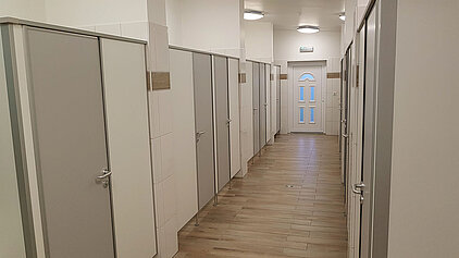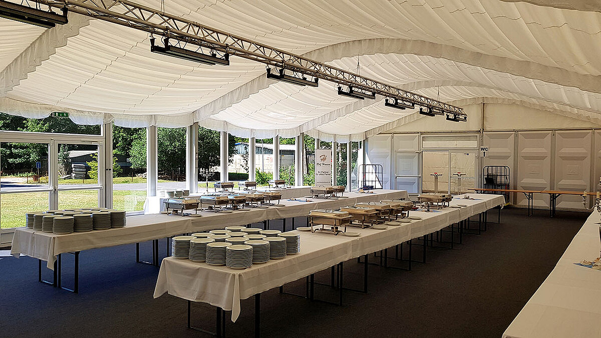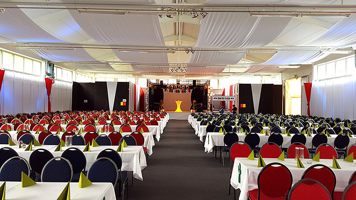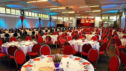 An länglichen Tischen können in der Festhalle bis zu 700 Personen Platz nehmen.
